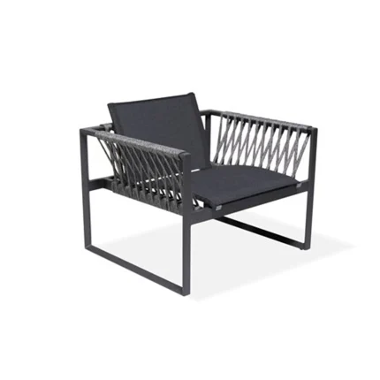 Armchair from the Montblanc collection with an aluminum frame, sunbrella sling fabric, and ropes crafted from synthetic polypropylene and acrylic fibers. Dimensions W: 35in | 89cm L: 30in |78cm H: 29in | 74cm